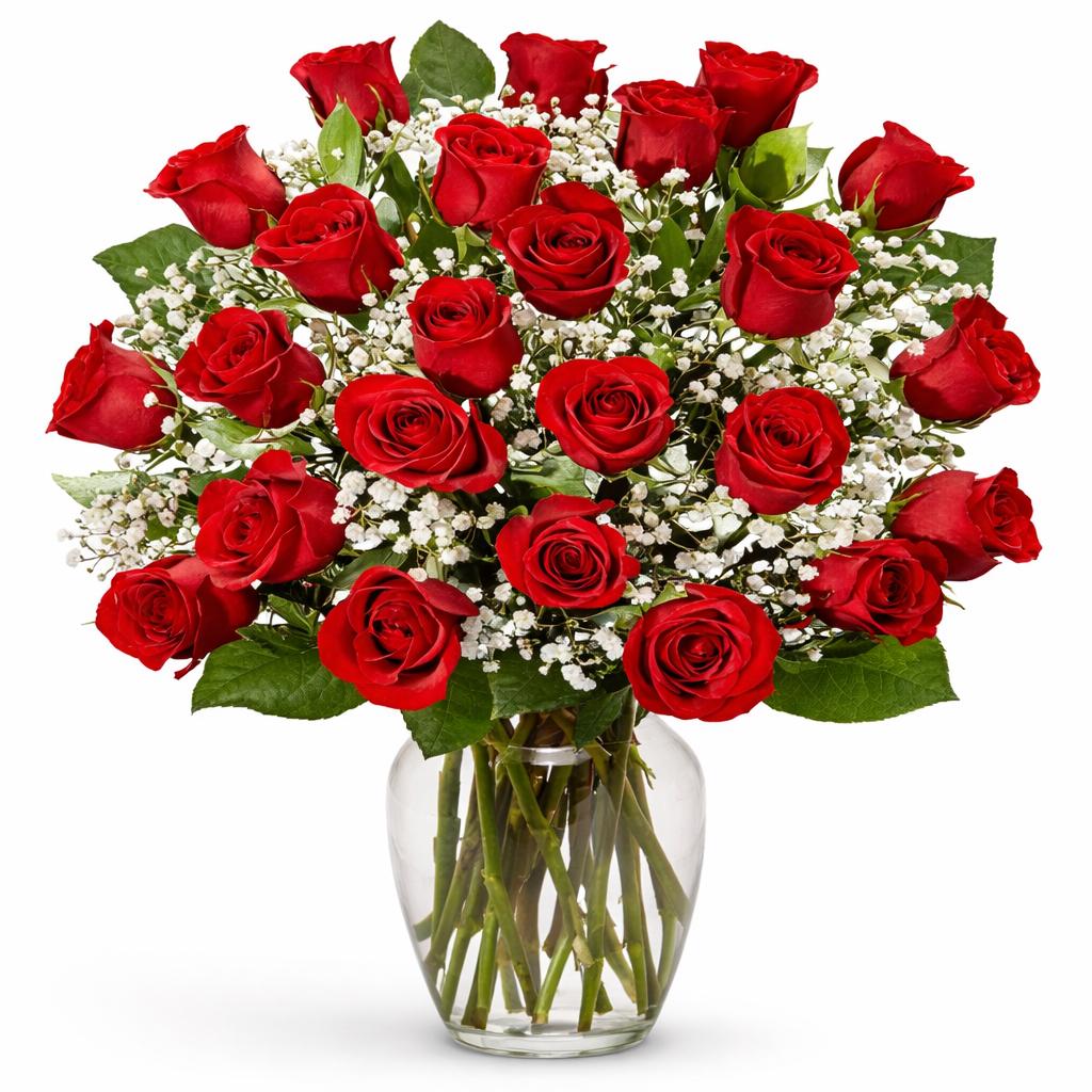 Dozens of lush red roses come together in a full and luxurious arrangement designed to impress. Rich in color and effortlessly romantic, this bouquet makes a powerful statement of admiration and devotion.